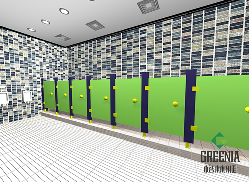 然後選取精致的衛生間隔斷板,柔和的色調,讓洗手間明亮,整潔,品質感強烈。童話般的設計,簡潔現代的設計理念。此方案簡潔,極具人性化。配合整個洗手間的明亮空間,層次分明,幹淨整潔,且富有童趣。